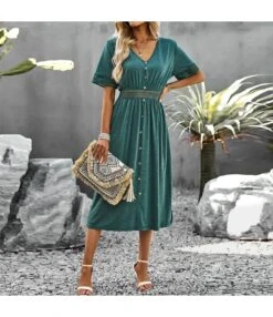 Casual Short-Sleeved Single-Breasted Solid Color V-Neck Long Dress Wholesale Dresses V5923050300060