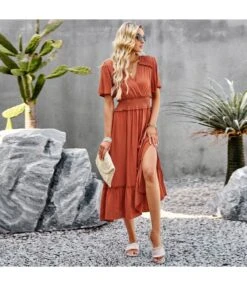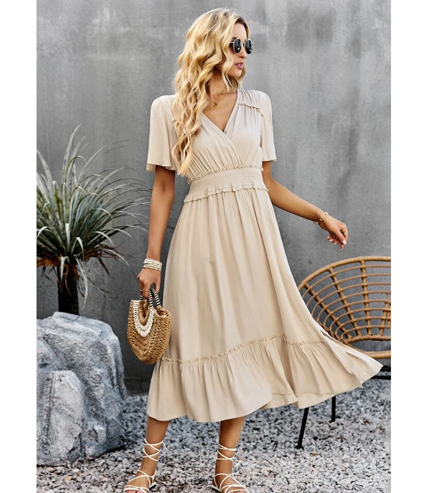 Sexy V-Neck Ruffles Dress Three-Quarter Sleeve Solid Color Wholesale Dresses SDN561494