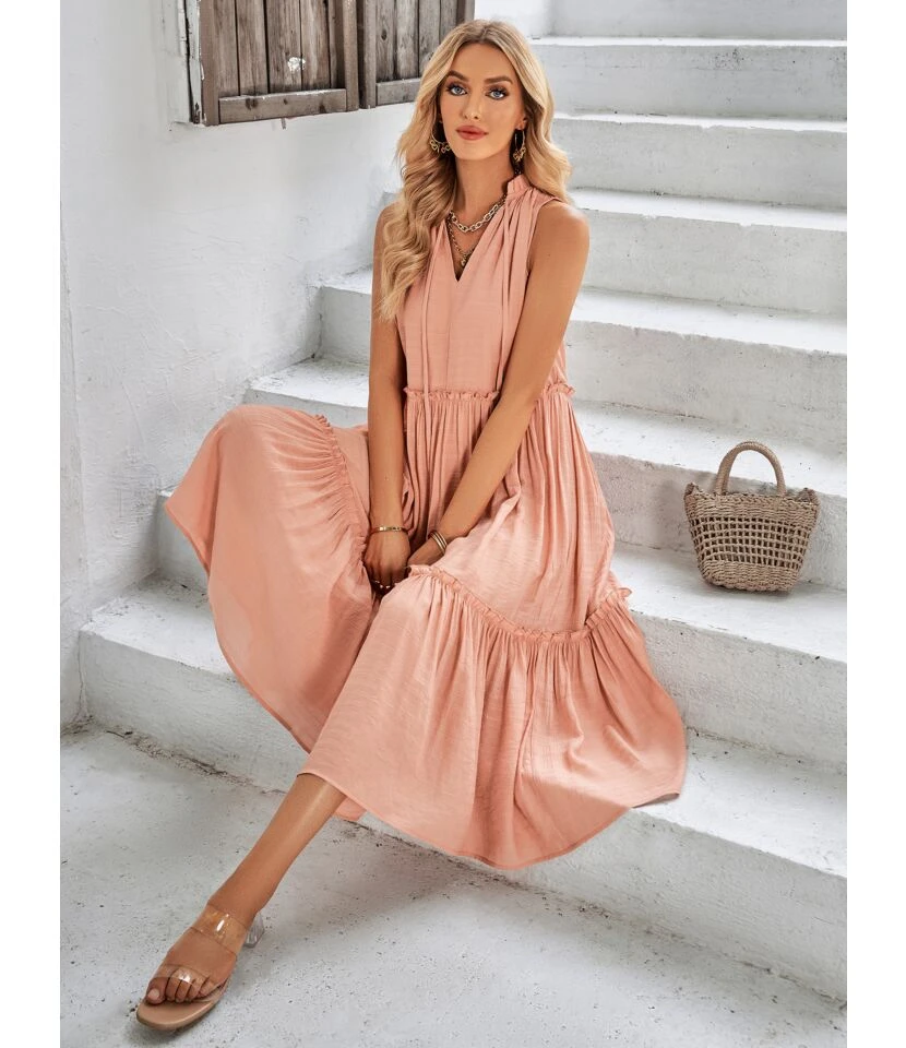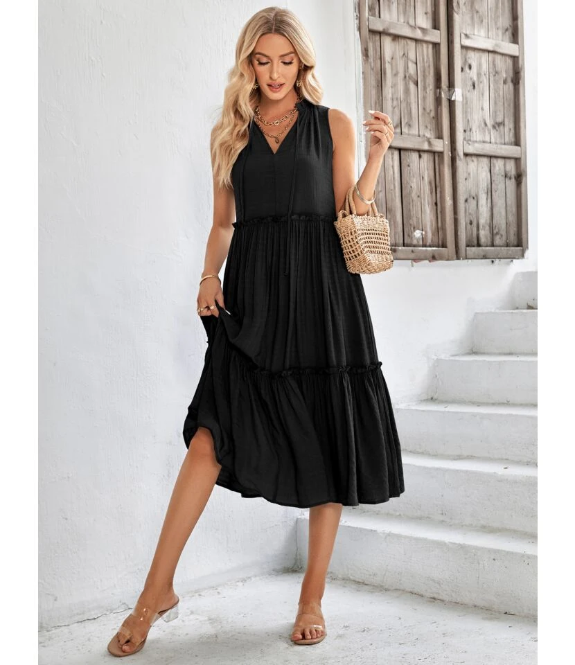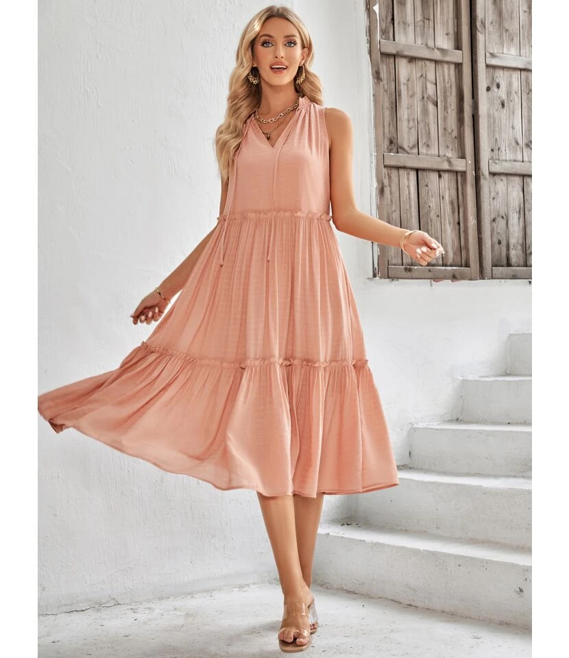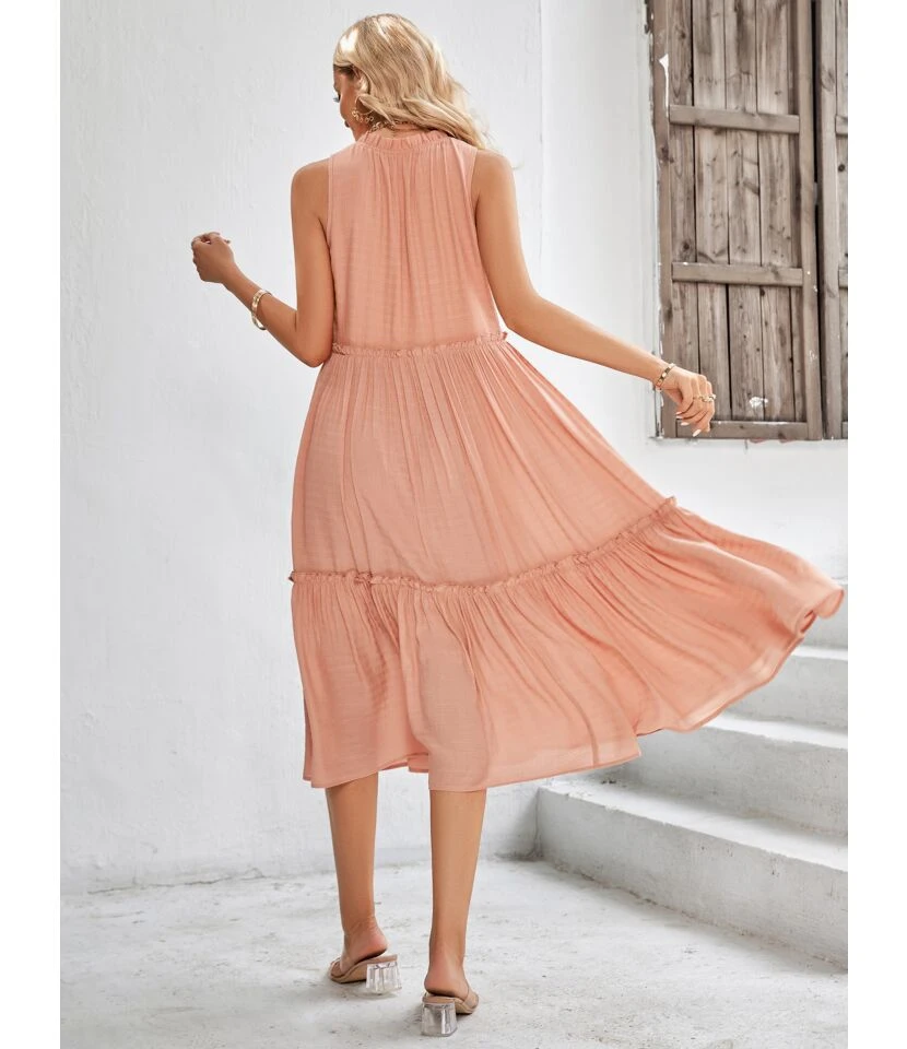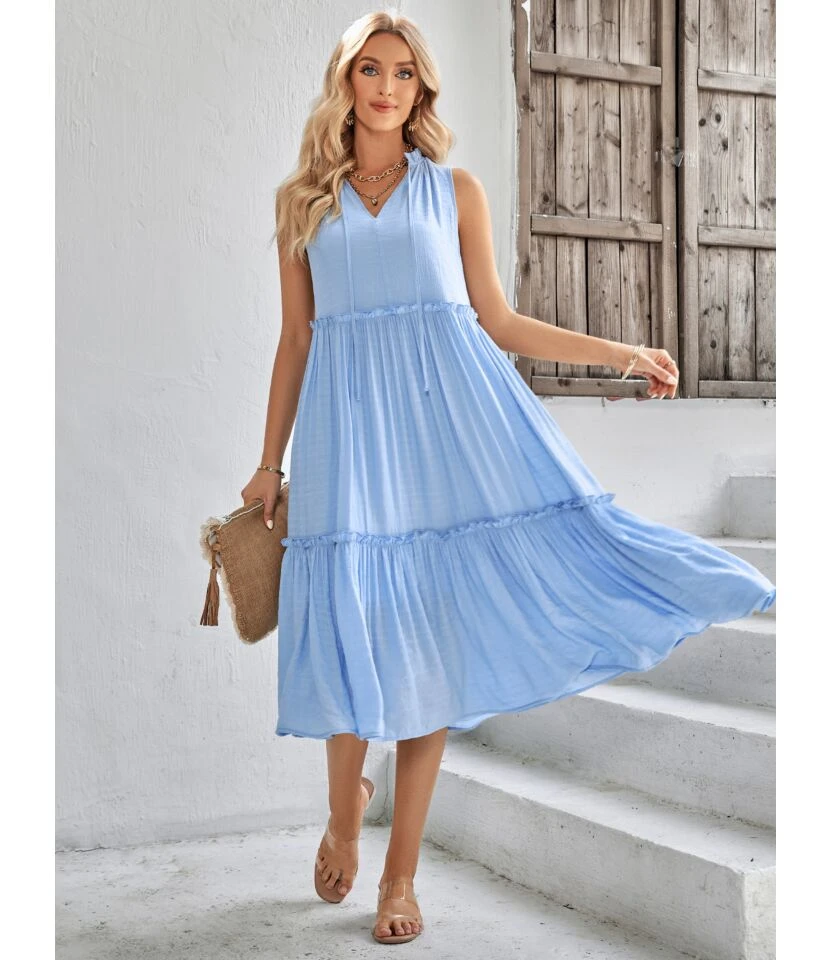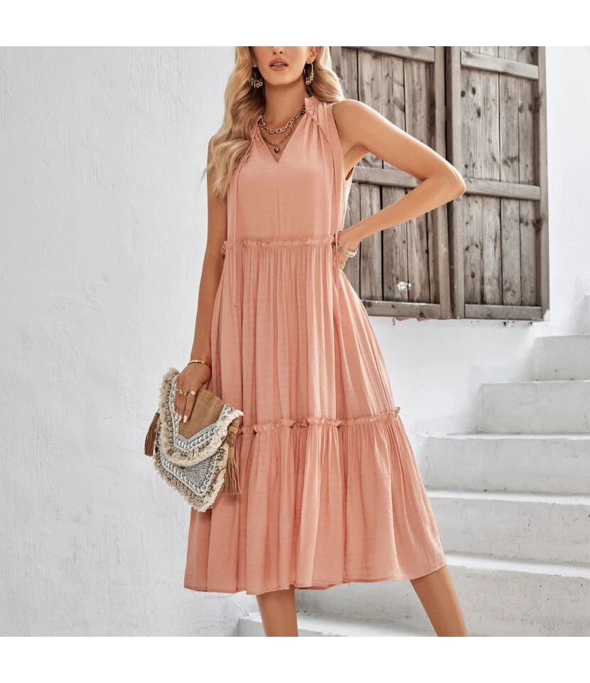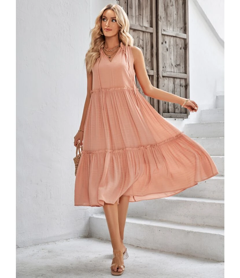 Summer Solid Color Simple Short Sleeve V-Neck Lace-Up Smocked Dress Wholesale Dresses N5323031600444