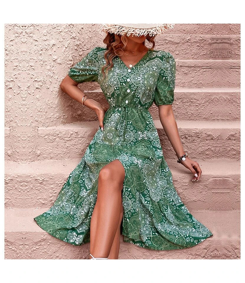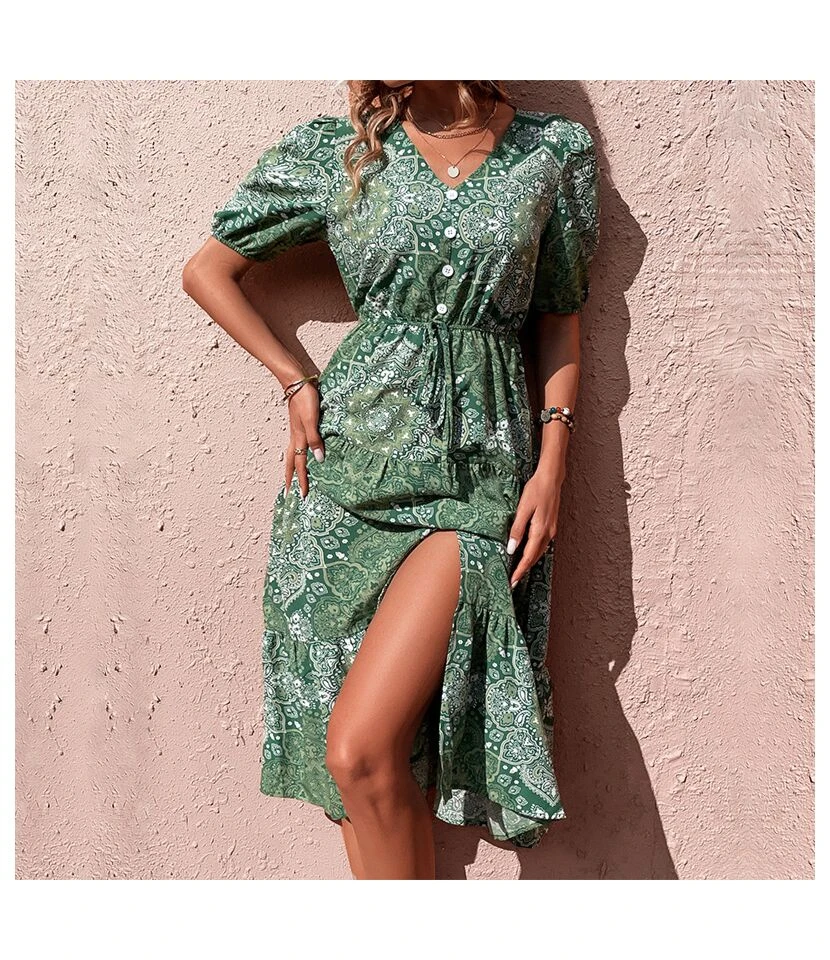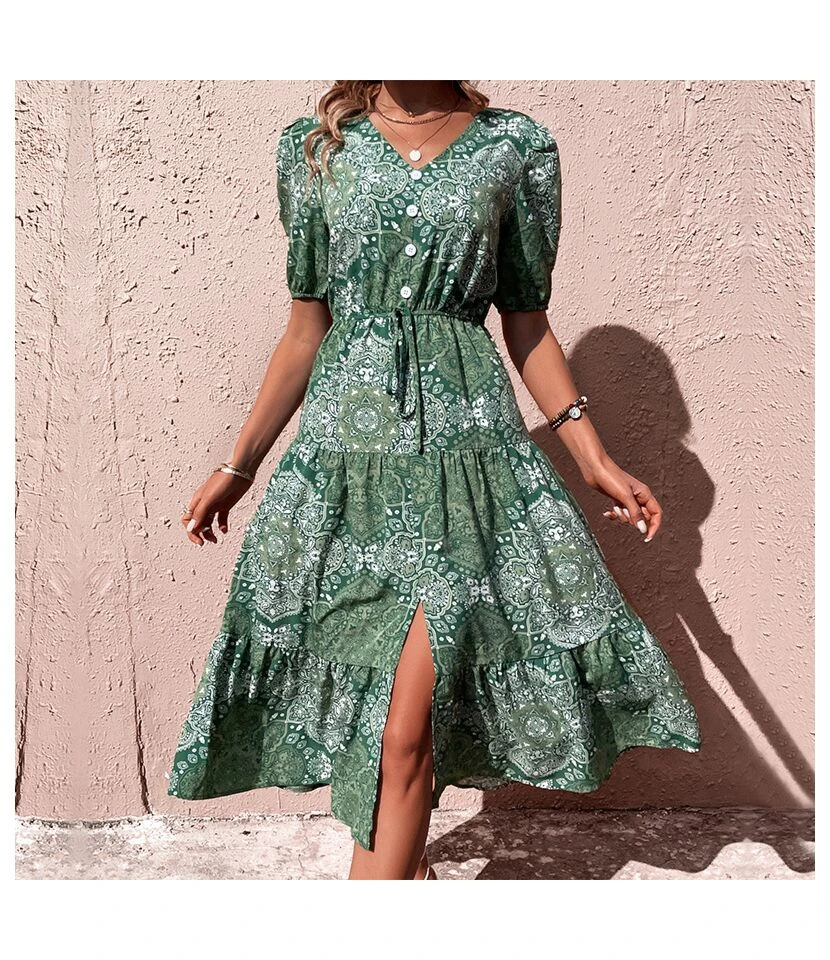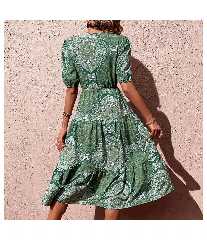 Summer Solid Color Simple Short Sleeve V-Neck Lace-Up Smocked Dress Wholesale Dresses N5323031600444
