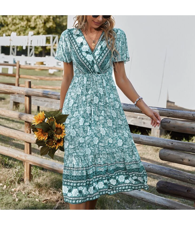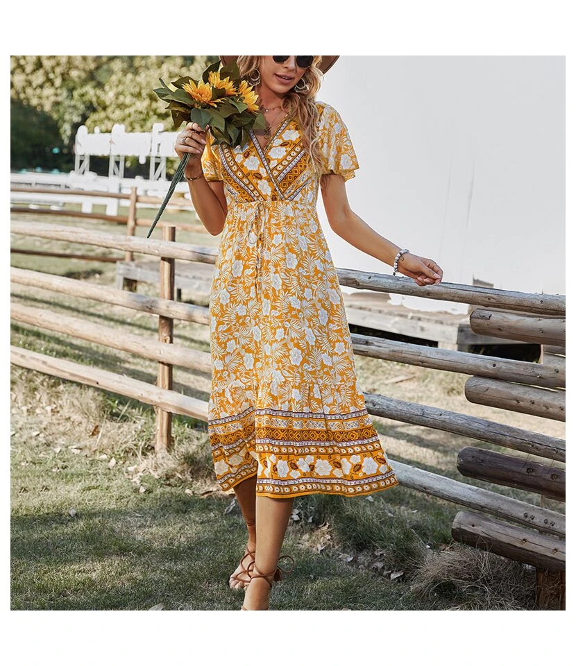 Be the first to review “Floral Print V Neck Short Sleeve Tie-Up Waist Casual Resort Dresses Wholeslae Bohemian Dress For Women SDN533130” Cancel reply
