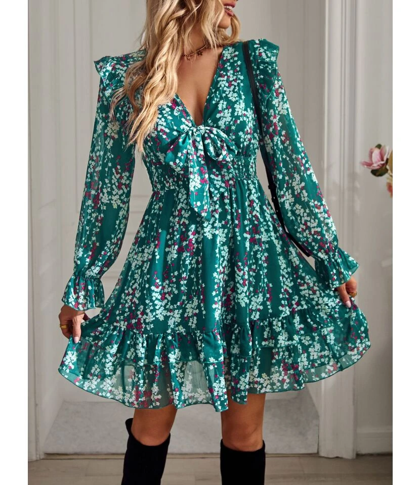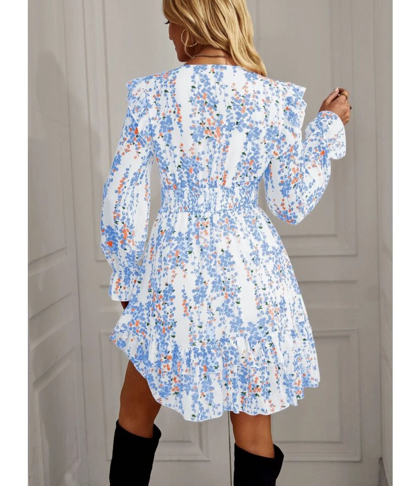 Women Fashion Floral Print Ruffle Short Sleeve High Waist Wholesale A-line Dresses SD184083