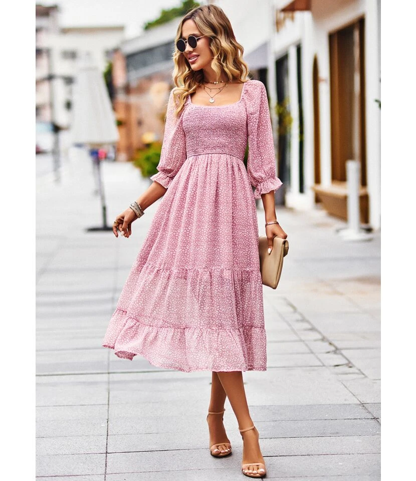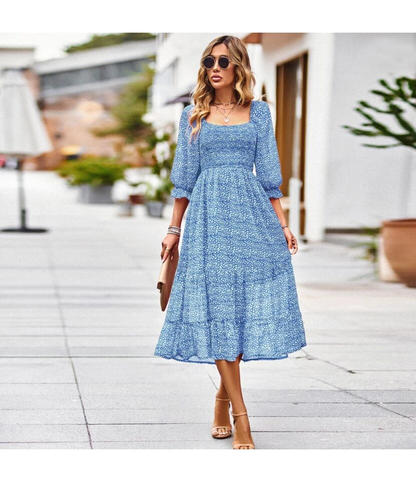 Floral Print Women Fashion Puff Sleeve Square Neck Split Hem Wholesale Midi Dresses SD184077