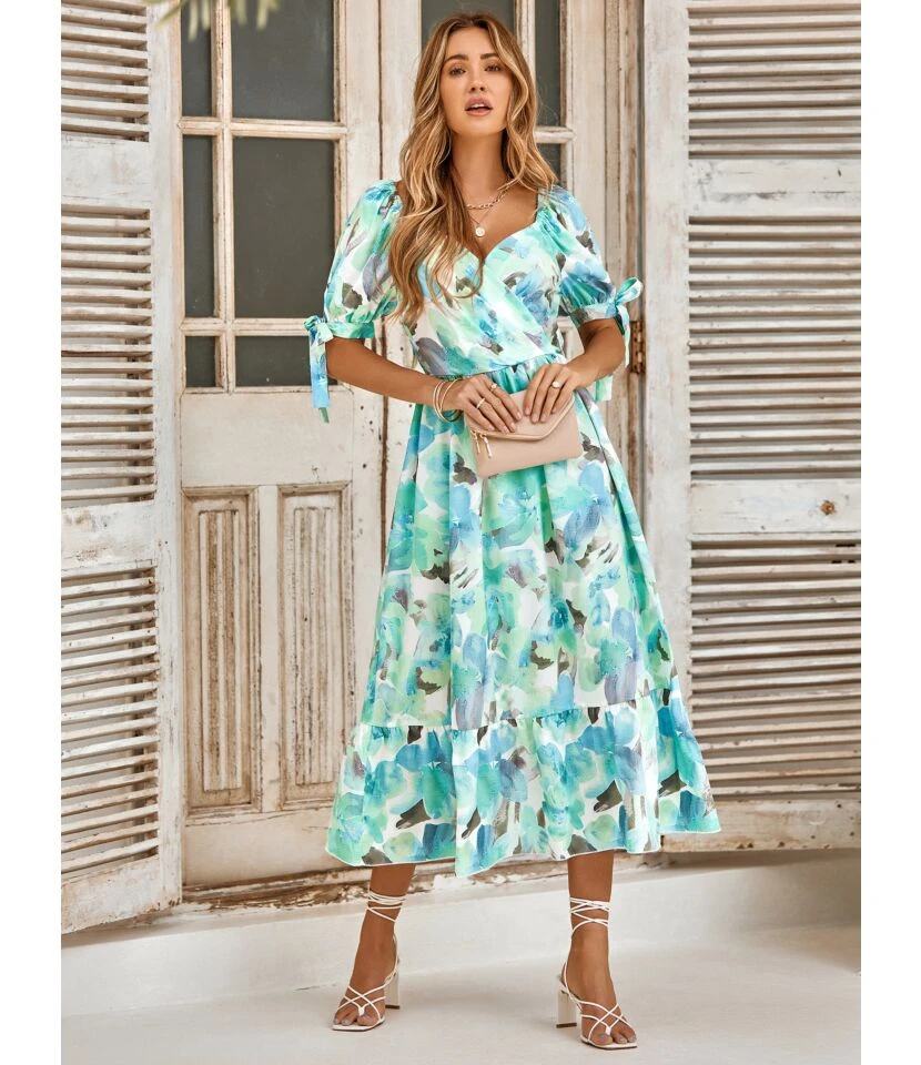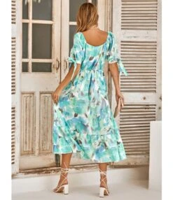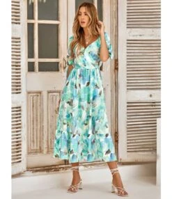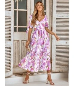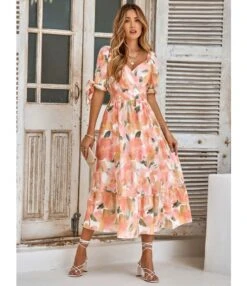 Commuting Short-Sleeved Solid Color Pleated V-Neck Dress Wholesale Dresses N461623030900084