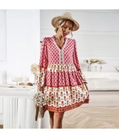 Lantern Sleeve Pleated Print Temperament Elegant Long-Sleeved Dress Wholesale Dresses N4623062500011
