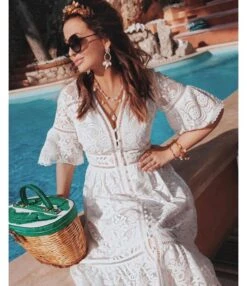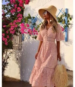 Be the first to review “Solid Color Short Sleeve Lace Hollow V-Neck Ruffle Dress Elegant Business Casual Women Wholesale Dresses SD531699” Cancel reply