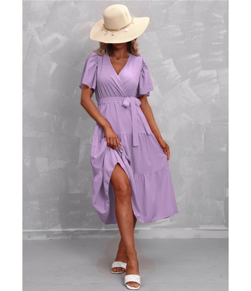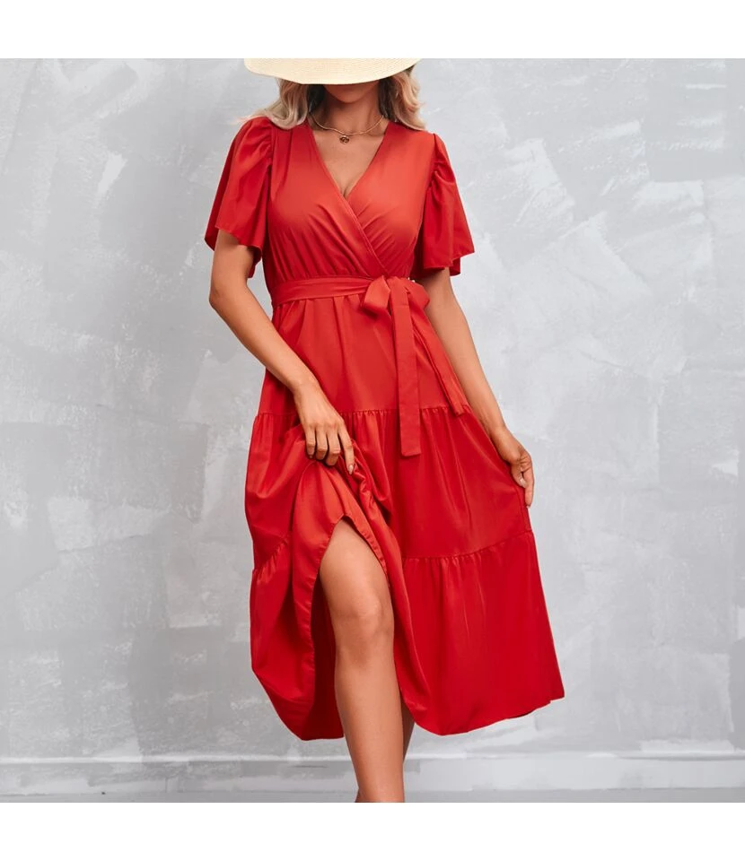 Summer Solid Color Simple Short Sleeve V-Neck Lace-Up Smocked Dress Wholesale Dresses N5323031600444