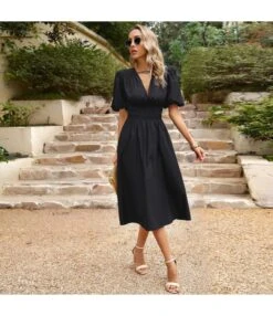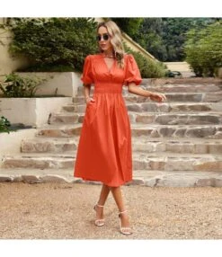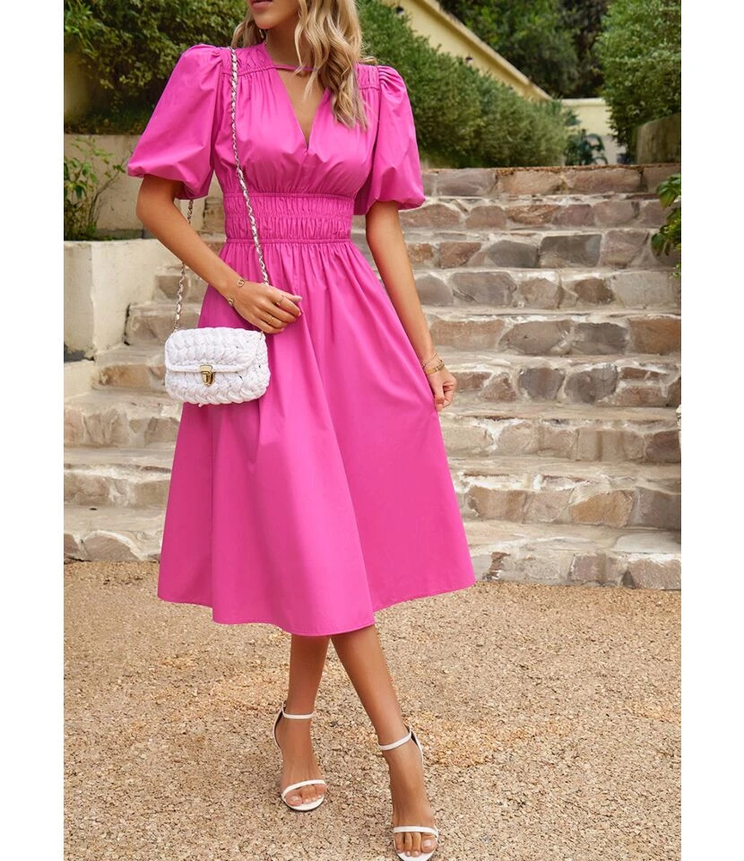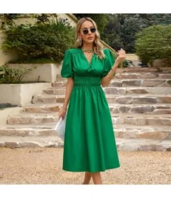 Casual Short-Sleeved Single-Breasted Solid Color V-Neck Long Dress Wholesale Dresses V5923050300060