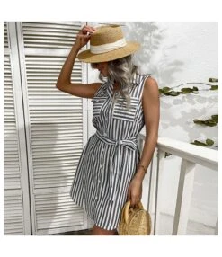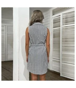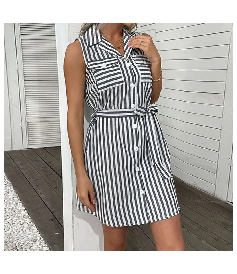 Be the first to review “Women Striped Print Sleeveless Lapel Collar V Neck Button Wholesale Shirt Dresses SD580145” Cancel reply